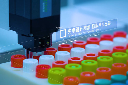 無(wú)人化實(shí)驗(yàn)室不僅體現(xiàn)在樣品的制備環(huán)節(jié)。通過(guò)“AGV+六軸機(jī)器人+電爪+視覺(jué)”的組合,樣品分杯后的96孔板試劑盒搬運(yùn)任務(wù)也能實(shí)現(xiàn)無(wú)人化。大寰電爪能夠完成抓取上下料任務(wù),將96孔板轉(zhuǎn)運(yùn)至儲(chǔ)存?zhèn)},或?qū)⑻幚砗蟮臉悠泛邪徇\(yùn)至檢測(cè)設(shè)備中,以穩(wěn)定抓持保證樣品搬運(yùn)途中的安全性。