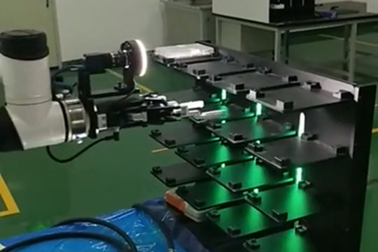 手機(jī)音頻檢測(cè)工藝段,機(jī)器人上、下料,機(jī)器人末端安裝夾爪,搬運(yùn)成品手機(jī)。PGE 系列工業(yè)薄型平行電爪,能夠快速完成產(chǎn)品換型的設(shè)備部署,電爪行程大、兼容性強(qiáng),能夾持不同尺寸的手機(jī),且驅(qū)控一體、精確力控,不用額為增加傳感器,便能完成手機(jī)檢測(cè)上下料。