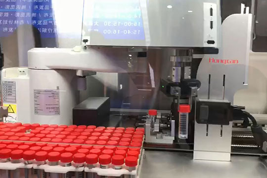 夾爪抓取病毒管,旋轉(zhuǎn)掃碼讀取采樣信息后,開(kāi)蓋,提取樣品到孔板內(nèi),關(guān)蓋,放回試管架。